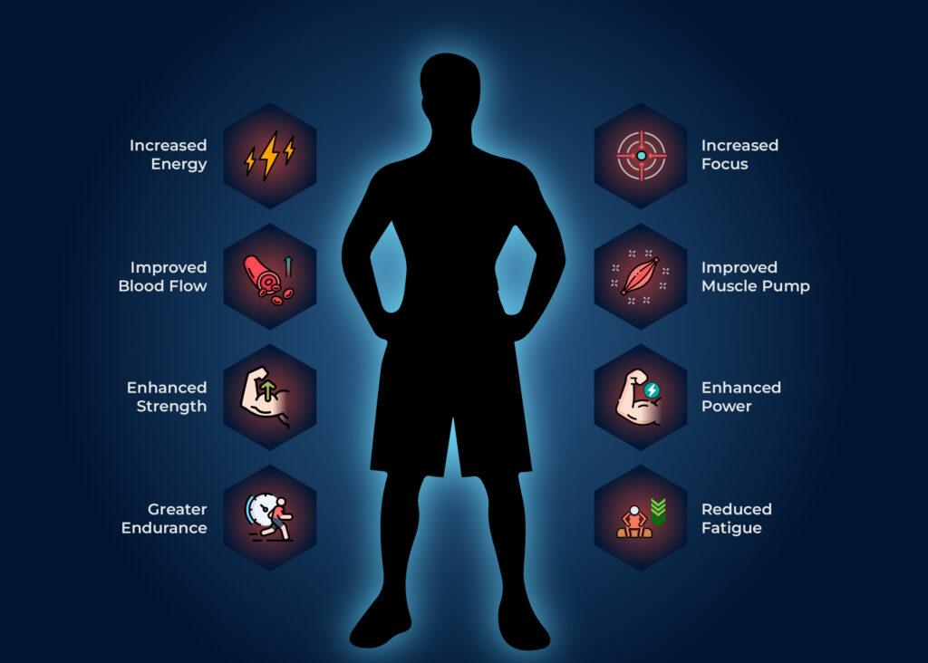 A bold infographic image featuring an athlete at the centre, with icons highlighting key pre-workout benefits: increased energy and focus, improved blood flow and muscle pump, enhanced strength and power, and greater endurance with reduced fatigue