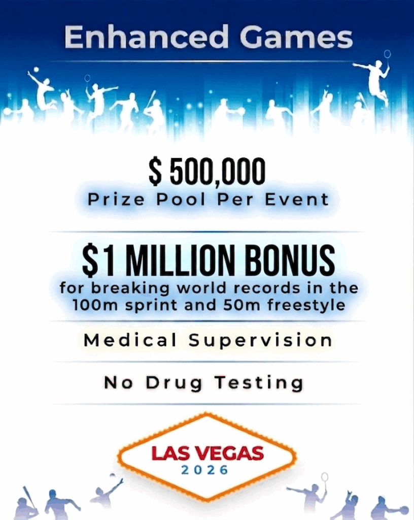 The Enhanced Games are scheduled for Las Vegas, Memorial Day weekend 2026. The event covers swimming, track, and weightlifting, with athletes competing without drug testing under full medical supervision.