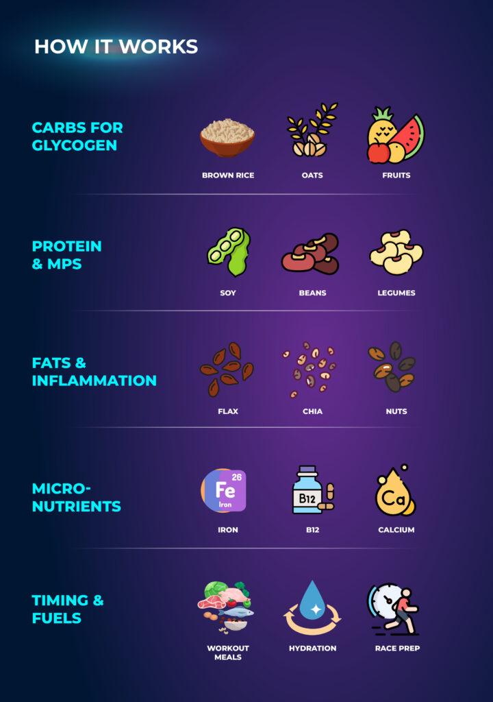 식물성 식단은 탄수화물로 훈련에 에너지를 공급하고, 꾸준한 단백질로 근육을 지지하며, 현명한 지방과 미량 영양소로 건강을 보호해. 통곡물 식품에 집중해. 검증된 보조제는 너의 스포츠와 목표에 맞을 때만 추가해. 매주 작은 성과들이 쌓여.