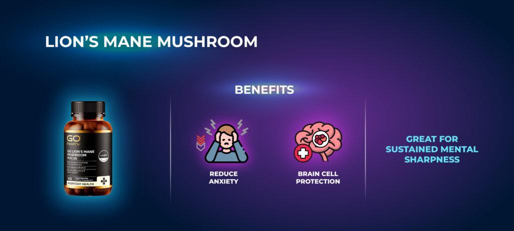 - Lion’s Mane promotes brain function and cognitive health by supporting nerve growth and reducing fatigue.