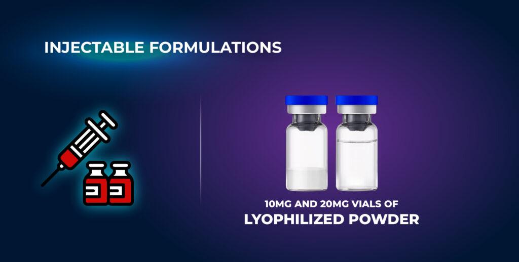 - 10mg and 20mg vials of lyophilized powder requiring reconstitution