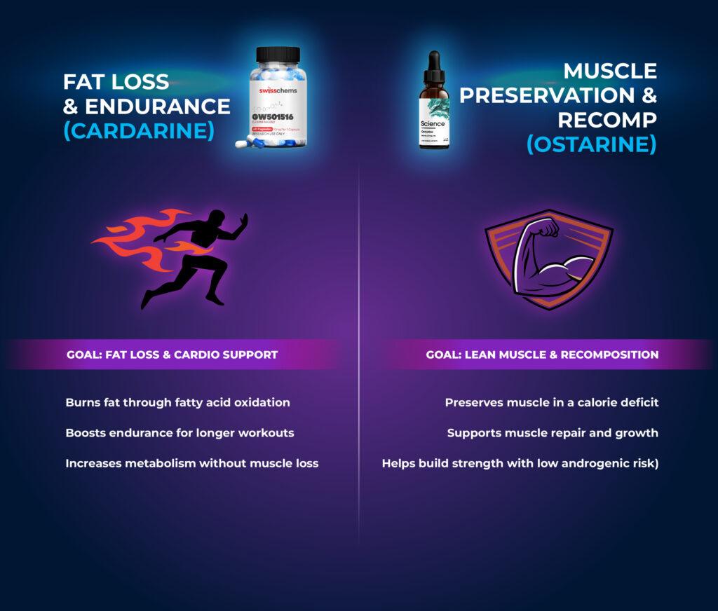 Cardarine vs. Ostarine shows a clear difference in how they work. Cardarine increases endurance and fat oxidation, so it works well for fat loss and cardio support. Ostarine helps preserve muscle mass and supports lean muscle tissue during fat loss.