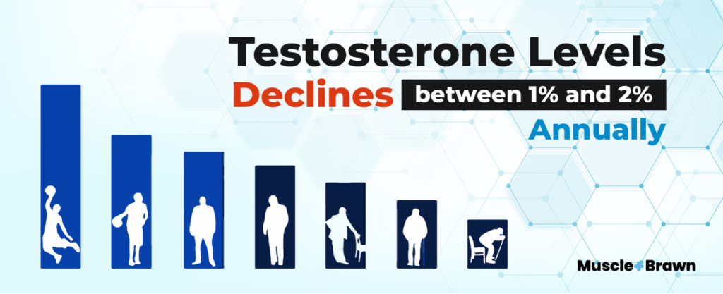 Lower levels of bioavailable testosterone decline between 1 and 2% annually on overage, showing that testosterone deficiency is a genuine concern among adult men. Testosterone therapy prescription is high in males, especially as the total testosterone levels continue to fall as we age.