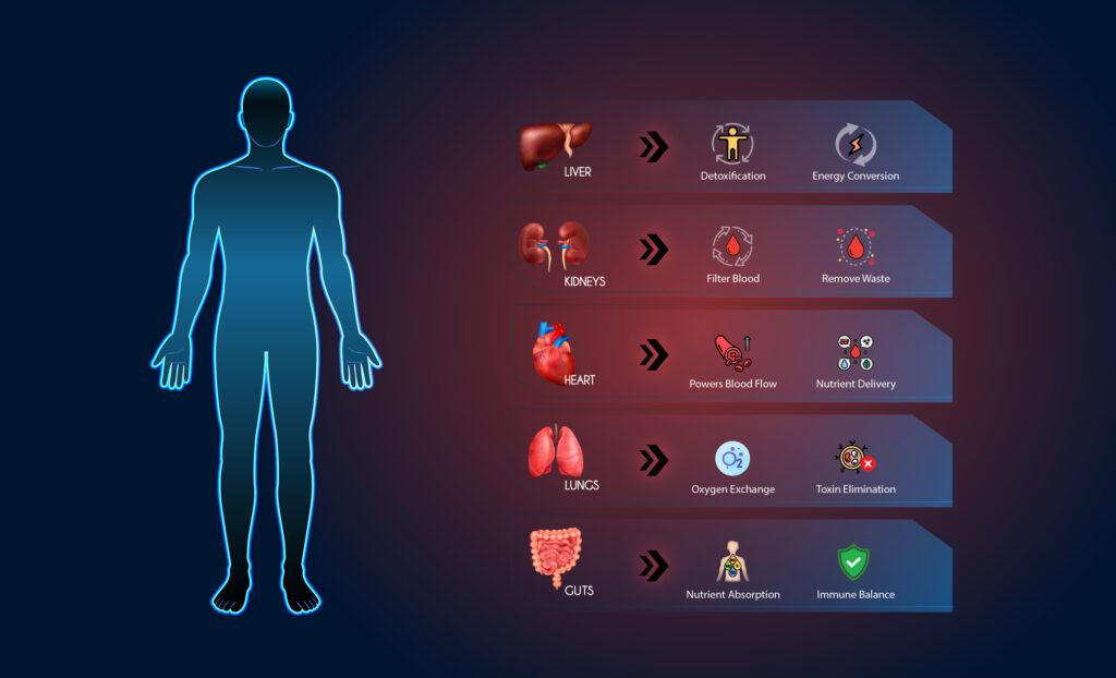 While the liver is the body’s primary detox organ, optimal health and performance depend on a network of organs working in harmony. Your kidneys, heart, lungs, and digestive system each play vital roles in filtering waste, maintaining nutrient balance, and supporting recovery, especially under physical or metabolic stress.