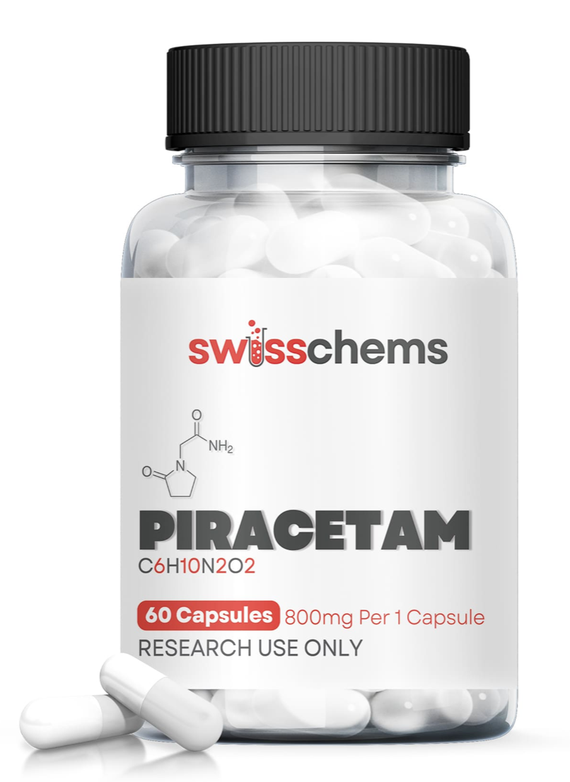 Swiss Chems offers Piracetam in capsule form — 48 grams total across 60 capsules, each dosed at 800mg. Piracetam is the original racetam compound, well-studied for its neuroprotective effects and potential to enhance memory, learning, and verbal fluency.