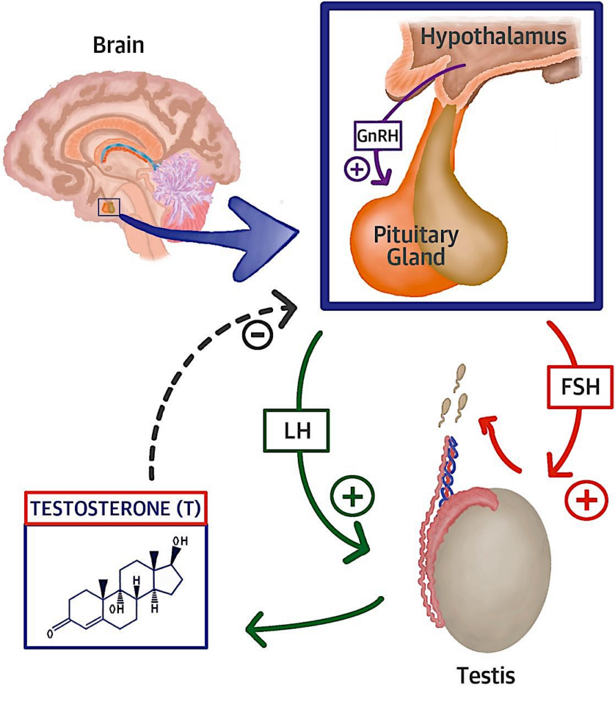Anabolic steroids (synthetic steroids that imitate testosterone) disrupt the hypothalamic-pituitary-gonads (HPG) axis, which is responsible for testosterone production. The testis is where testosterone is predominantly produced as a result lutenizing hormone being released from the pituitary gland. But, anabolic steroids can interfere with this process by binding to testosterone receptors in the brain, which leads to decrease production of bioavailable testosterone in the testis.