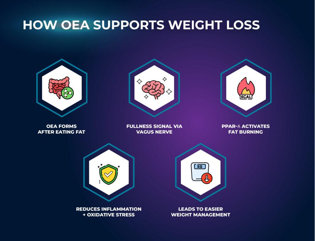 การเลือกใช้ผลิตภัณฑ์เสริมอาหารอย่างชาญฉลาดจะช่วยให้ OEA ทำงานได้ดียิ่งขึ้น ช่วยควบคุมความอยากอาหารและเพิ่มการเผาผลาญพลังงาน เป้าหมายนั้นง่ายมาก: รับประทานแคลอรี่น้อยลง ใช้ไขมันได้อย่างมีประสิทธิภาพมากขึ้น และลดการอักเสบ