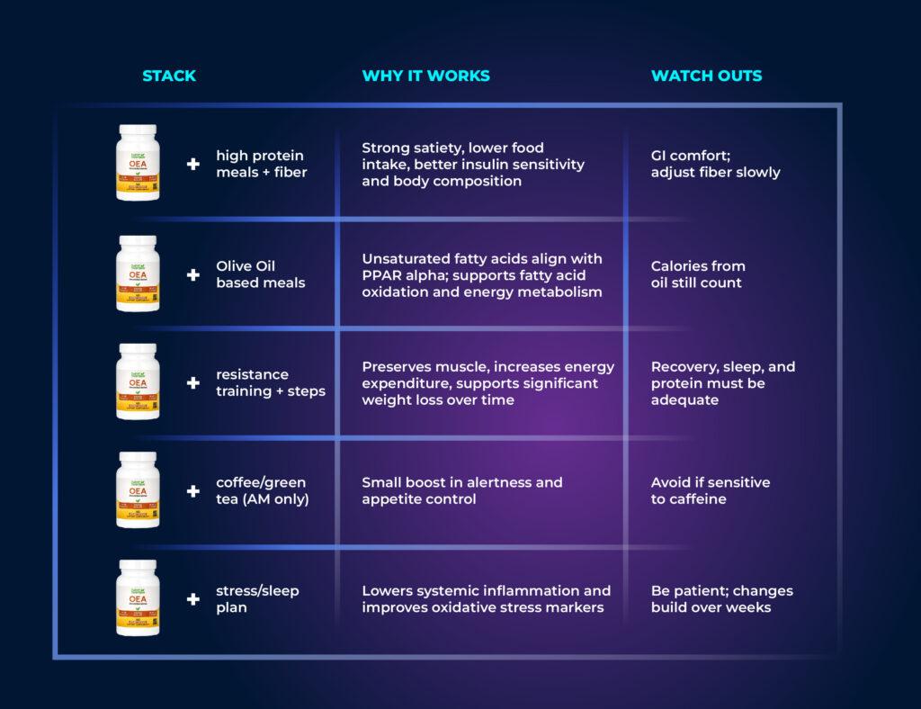 OEA จะได้ผลดีที่สุดเมื่อใช้ร่วมกับการควบคุมอาหารและการออกกำลังกายที่ดี ผลของ OEA จะเพิ่มมากขึ้นเมื่อปริมาณโปรตีน การเดิน และการนอนหลับมีความสม่ำเสมอ เมื่อการวิจัยเพิ่มมากขึ้น เราจะเรียนรู้ว่าการเสริม OEA เหมาะสมกับกลุ่มประชากรและเกณฑ์การคัดเลือกที่แตกต่างกันอย่างไร ตั้งแต่ผู้ใหญ่ที่มีน้ำหนักเกินไปจนถึงผู้ป่วยโรคอักเสบ