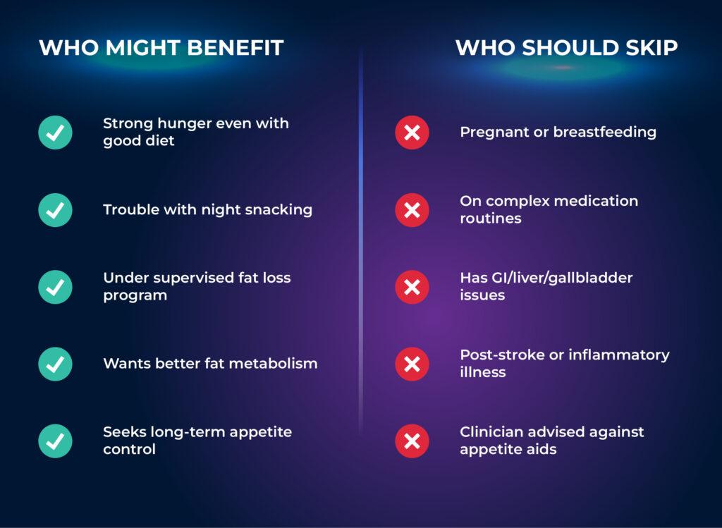 - หากความหิวไม่ลดลงหรือมีผลข้างเคียงเกิดขึ้น ให้หยุดรับประทานและปรึกษาแพทย์ก่อนรับประทานต่อ 🧭