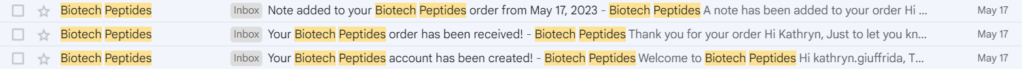 เมื่อส่งคำสั่งซื้อ ผมได้รับอีเมล 3 ฉบับจาก Biotech Peptides ฉบับแรกเป็นอีเมลยืนยันการสร้างบัญชี ฉบับที่สองเป็นอีเมลยืนยันคำสั่งซื้อ และอีเมลฉบับที่สามให้หมายเลขติดตามพัสดุสำหรับคำสั่งซื้อของผม ผมได้รับคำสั่งซื้อภายใน 2 วันทำการ