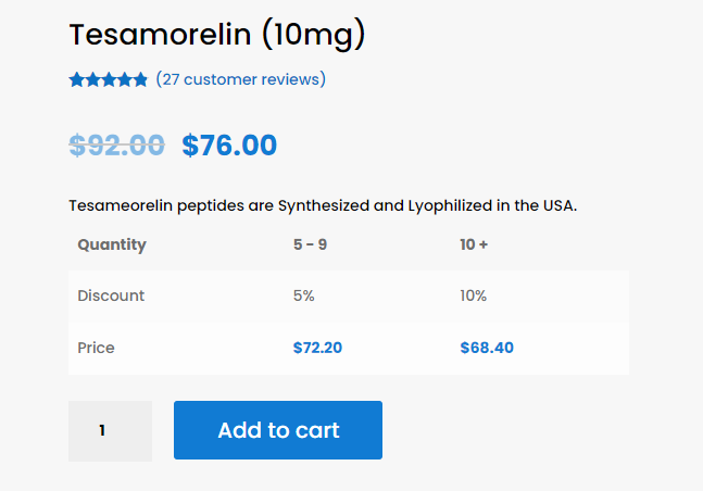 เมื่อผมตัดสินใจว่าพร้อมที่จะซื้อ Tesamorelin และ PT-141 แล้ว ก่อนอื่นผมต้องตัดสินใจเลือกปริมาณสำหรับการซื้อของผม ผมตัดสินใจลองแค่ 1 ชิ้นและกด "เพิ่มลงในรถเข็น"