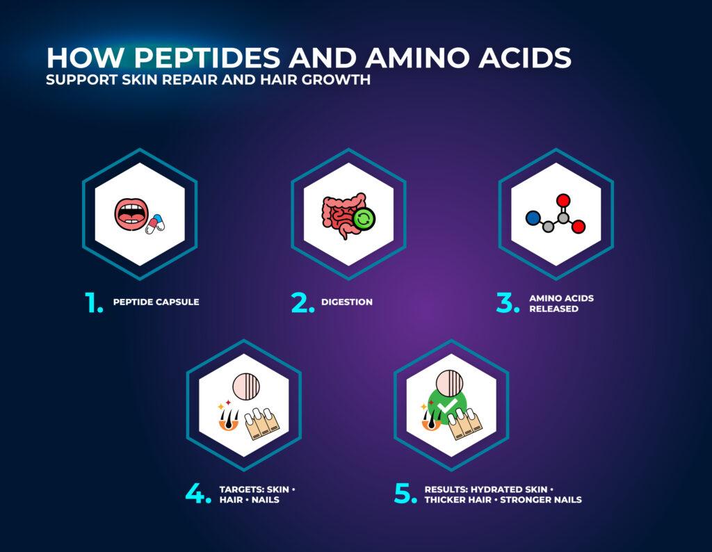 ผลิตภัณฑ์เสริมอาหารเหล่านี้มีจุดมุ่งหมายเพื่อสนับสนุนสุขภาพในหลายๆ ด้านอย่างชัดเจน คอลลาเจนอาจช่วยเสริมสร้างเกราะป้องกันผิว ลดขนาดรูขุมขน และส่งเสริมสุขภาพผมและเล็บที่ดีขึ้น โดยมีผลการศึกษาทางคลินิกสนับสนุนในบางด้าน ส่วนผสมอื่นๆ มีจุดประสงค์เพื่อซ่อมแซมกล้ามเนื้อ ฟื้นฟูกล้ามเนื้อ และเสริมสร้างกล้ามเนื้อหลังการฝึกซ้อม เปปไทด์นั้นแตกต่างจากฮอร์โมนและวิตามิน แต่หลายชนิดก็วางจำหน่ายในฐานะผลิตภัณฑ์เสริมอาหาร พวกมันทำงานร่วมกับโปรตีนและโมเลกุลอื่นๆ และผลลัพธ์อาจแตกต่างกันไป
