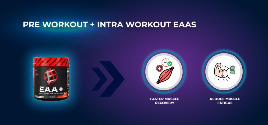 การรับประทานพรีเวิร์คเอาท์ก่อนการฝึกและจิบกรดอะมิโนที่จำเป็น (EAAs)ระหว่างการออกกำลังกายช่วยลดความเมื่อยล้าของกล้ามเนื้อและสนับสนุนการฟื้นตัวของกล้ามเนื้อที่เร็วขึ้น การรวมนี้ช่วยรักษามวลกล้ามเนื้อและส่งเสริมความทนทานที่ดีขึ้นในระหว่างการฝึกที่มีปริมาณสูง
