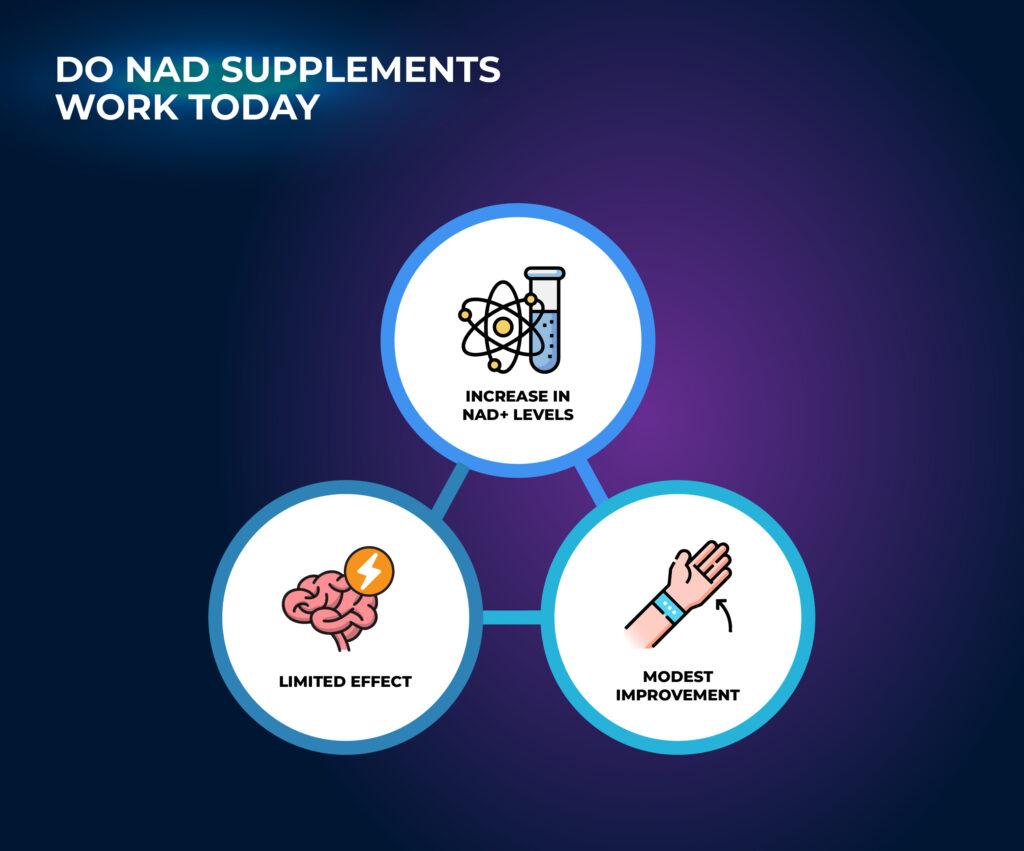 การเพิ่ม NAD อาจช่วยสนับสนุนการทำงานของเซลล์ ประโยชน์จะแสดงให้เห็นบนตัวชี้วัดที่เป็นผลทางอ้อมก่อน ซึ่งรวมถึง NAD ในเลือดที่สูงขึ้น, สารบ่งชี้การอักเสบที่ลดลงในการศึกษาบางส่วน, และความไวต่ออินซูลินที่ดีขึ้นในกลุ่มที่เลือก การเปลี่ยนแปลงเหล่านี้ชี้ให้เห็นถึง ศักยภาพของ NAD ต่อสุขภาพโดยรวม อย่างไรก็ตาม หลักฐานทางการแพทย์ยังคงต้องการความลึกซึ้งและการติดตามผลในระยะยาว
