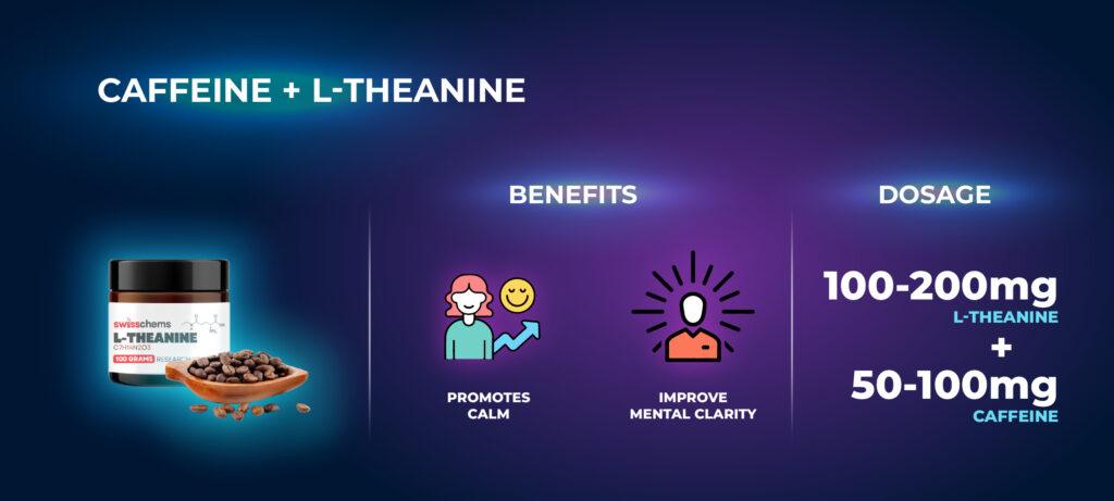 - ปริมาณทั่วไป: L-Theanine 100–200 มก. กับคาเฟอีน 50–100 มก. 30–60 นาทีก่อนการทำงาน