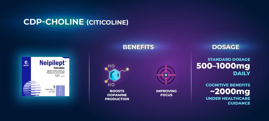 อาหารเสริมอย่าง Alpha-GPC และ CDP-Choline มุ่งเป้าไปที่ระบบการสื่อสารของสมอง พวกมันเพิ่มระดับอะเซทิลโคลีน ซึ่งช่วยให้สมองประมวลผลข้อมูลและส่งสัญญาณได้เร็วขึ้น สิ่งนี้ช่วยปรับปรุงความเร็วในการตอบสนองทางความคิด ให้คุณได้เปรียบในกีฬา เกม และชีวิตประจำวัน CDP-Choline ยังเพิ่มโดปามีนและพลังงานสมอง ซึ่งสำคัญต่อความตั้งใจ สมาธิ และแรงจูงใจ
