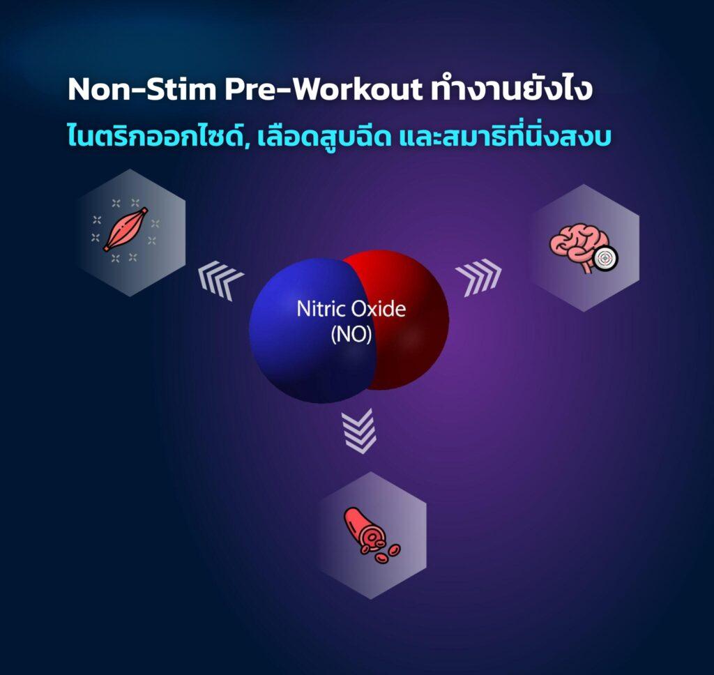 หัวใจสำคัญของ Pre-workout แบบไร้สารกระตุ้น (Non-stim) คือการเน้นไปที่ ไนตริกออกไซด์ (Nitric Oxide) ครับ เจ้าตัวนี้มีหน้าที่ช่วยขยายหลอดเลือด ทำให้เลือดไหลเวียนไปที่กล้ามเนื้อได้สะดวกขึ้น ผลที่ตามมาคืออาการ "Pump" แบบแน่นเปรี๊ยะนั่นเอง